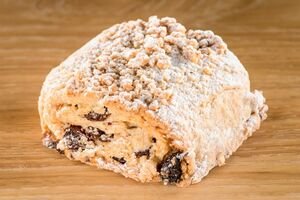 DINKELmürbeteig (DINEKL, DINKELmehl 630er, BUTTER, Rohrohrzucker, Weinsteinbackpulver, Meersalz), Honigmarzipan, HASELNÜSSE, Rosinen, DINKELstreusel (DINKEL, DINKELmehl 630er, BUTTER, Rohrohrzucker, belebtes Wasser, Gewürze, Weinstein-Backpulver, Meersalz), Aprikosenmarmelade, Rohrohrpuderzucker, Zimt.